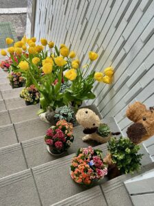 出入口の階段のチューリップが今年も綺麗に咲きました。